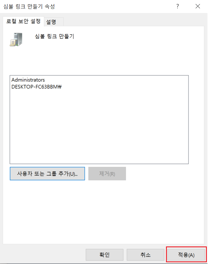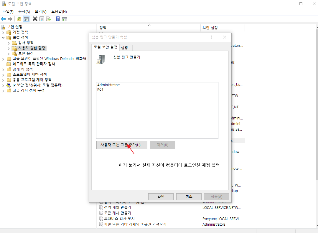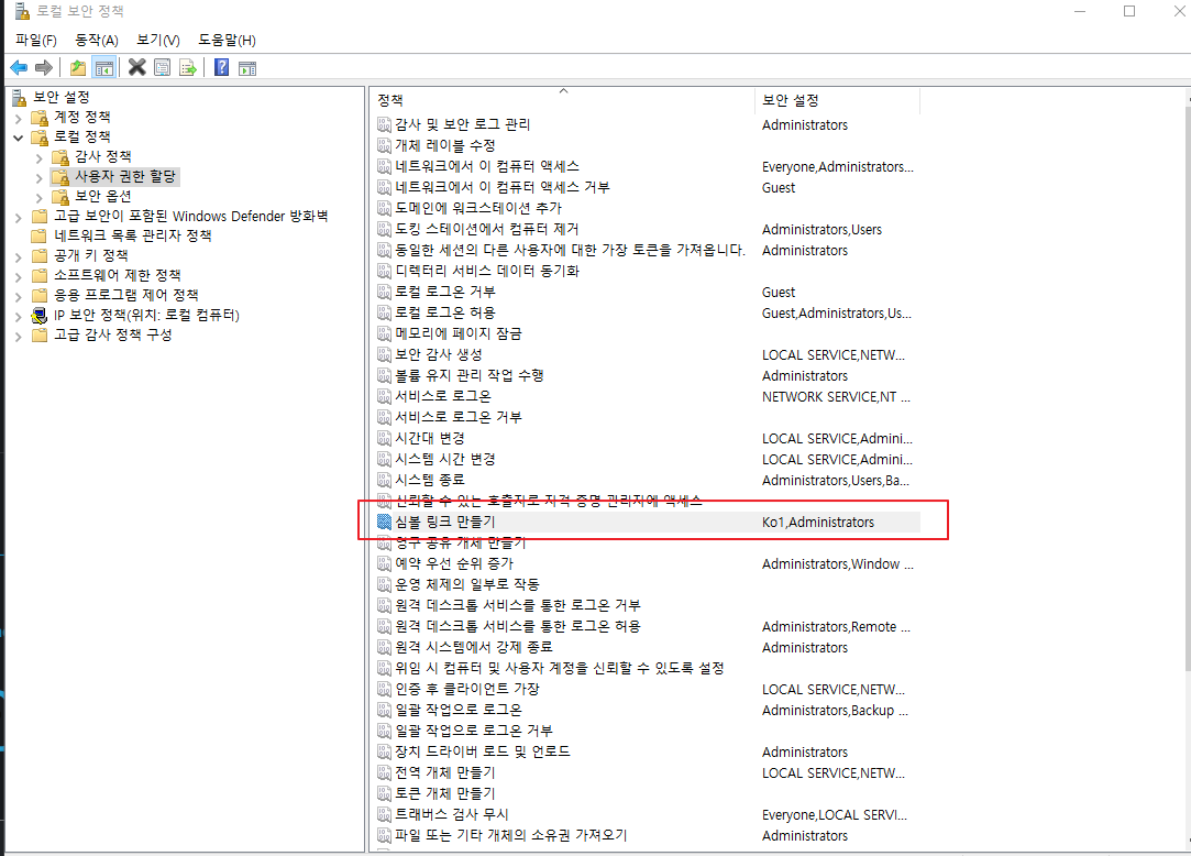 로컬 정책 -> 사용자 권한 할당 -> 심볼 링크 만들기 더블클릭