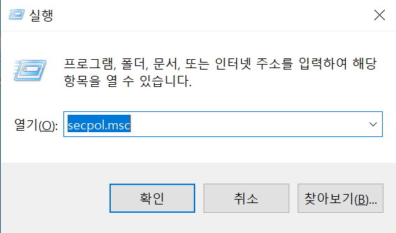 2) secpol.msc 입력 후 학인 클릭