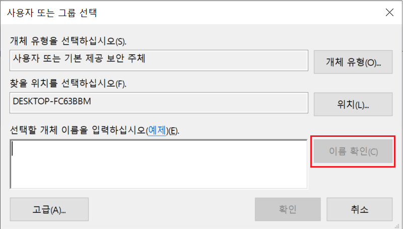 5) 선택할 개체 이름을 입력하십시오. 영역에 자신의 컴퓨터 이름을 쓰고 이름 확인 버튼을 누른다.