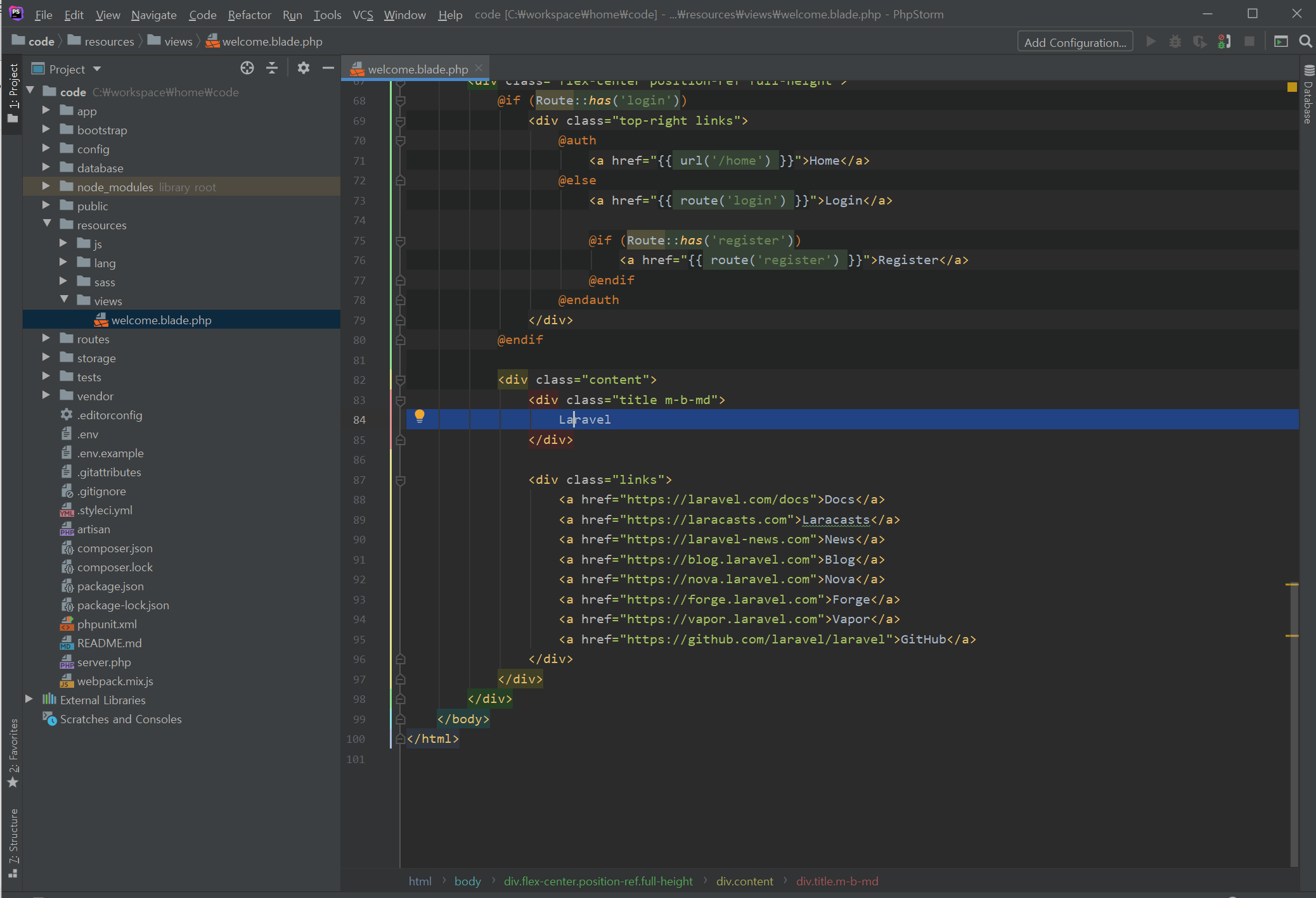 이 페이지에서 저 Laravel이란 텍스트만 약간 수정해보자.