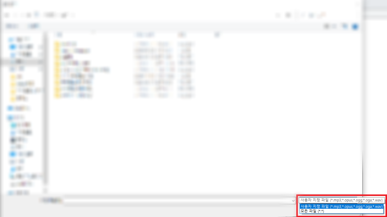 선택 가능한 파일이 지정되어있다. (*.mp3, *.opus, *.ogg, *oga, *.wav)